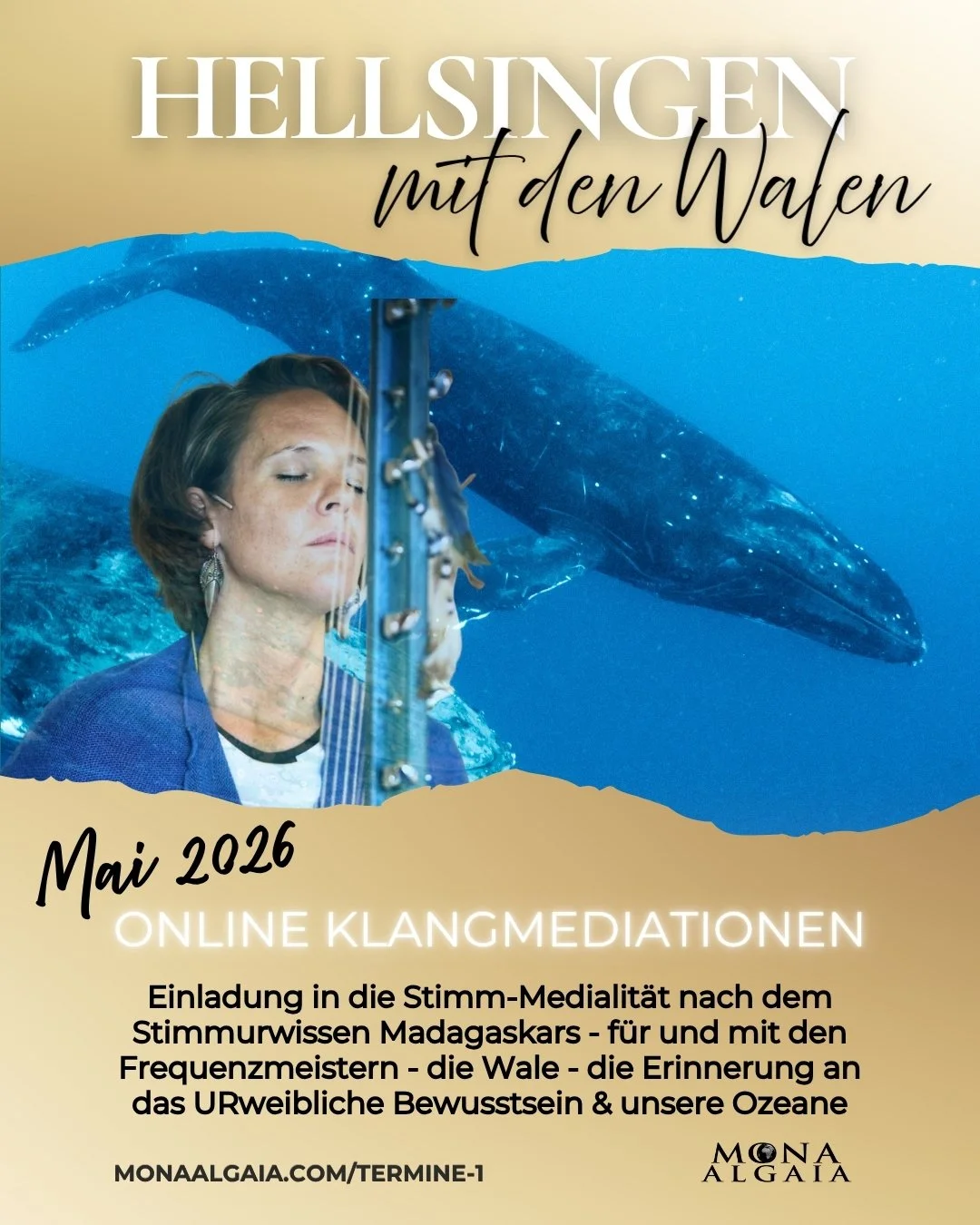 Als Aufruf, das lemurische urweibliche Bewusstsein in deinem Alltag zu erinnern und integrieren, die Frequenzkraft der Wale zu fühlen, den Ursprung des Meeres zu hüten und sensitiv-medial zu kommunizieren: im Mai immer Montags: 4. Mai / 11. Mai / 18. Mai / 25. Mai 2026, je 19-21 Uhr